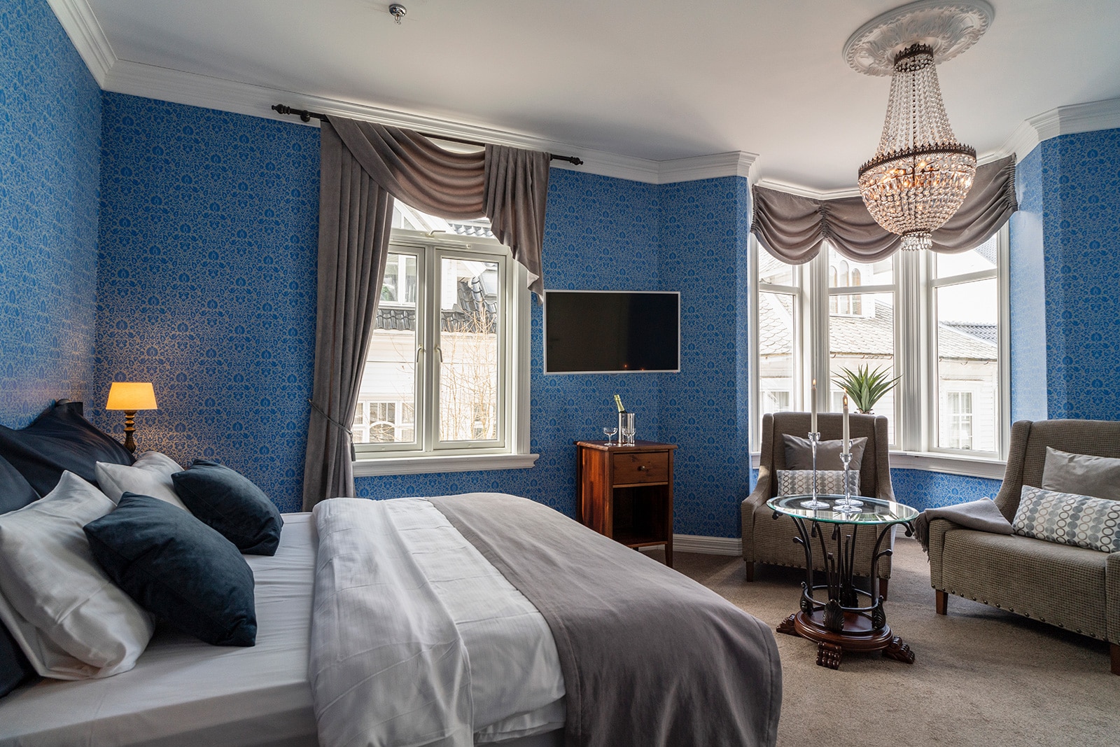 The hotel’s architecture, in classic Swiss style complete with octagonal towers, has made it one of Flekkefjord’s most photographed landmarks. Behind its beautiful façade, you’ll find a modern hotel with 26 individually designed rooms where style and comfort go hand in hand. Each room tells its own story, and the recent modernization ensures guests can enjoy a seamless blend of historic charm and top modern amenities.